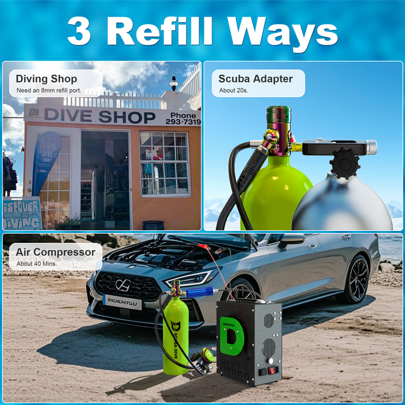 Dive shops,hand pumps,electric pumps,or tank transfers—choose the best refill method for your needs.Our 1L diving tank fits every solution.Note:Using a high-pressure hand pump to inflate may take an hour,but of cource if you love fitness,it can also be used as a tool for exercise.Experience the perfect balance of strength and buoyancy with our 6061 aerospace-grade aluminum construction.This specialized material—identical to what's used in aircraft frames—delivers a remarkable density of just 2.6 compared to steel's 7.8,reducing weight by two-thirds without compromising structural integrity during deep water descents.